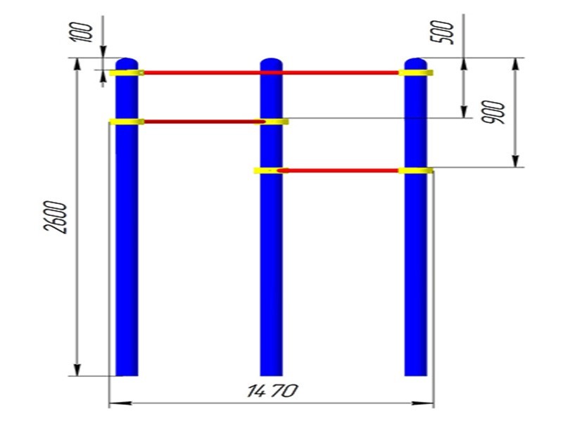 Материалы: Толстостенная труба.Весь применяемый металлопрокат соответствует ГОСТ 10705-80, ГОСТ 1577-93. Сварные швы конструкций из металла обработаны и отшлифованы (ГОСТ Р 52169-2012 п.4.3.10). Все металлические элементы окрашиваются глянцевой порошковой краской, соответствующей требованиям санитарных норм и экологической безопасности. Для более качественного прокраса все металлические элементы проходят двойной цикл покраски.Крепеж оцинкован.Выступающие части резьбовых соединений закрыты пластиковыми заглушками (ГОСТ Р 52169-2012 п. 4.3.9).Крепление элементов оборудования исключает возможность их демонтажа без применения инструментов (ГОСТ Р 52169-2012 п. 4.3.13).Изделие сопровождается: а) техническим паспортом завода-изготовителя (ГОСТ Р 52301-2004 п. 5), в котором указано предназначение, номер изделия, правила безопасной эксплуатации и схема сборки.б) комплектом крепежа для сборки и монтажа.Сборочно-монтажные работы выполняются с соблюдением требований национальных стандартов по установке детского игрового оборудования и согласно схемам монтажа предприятия-изготовителя